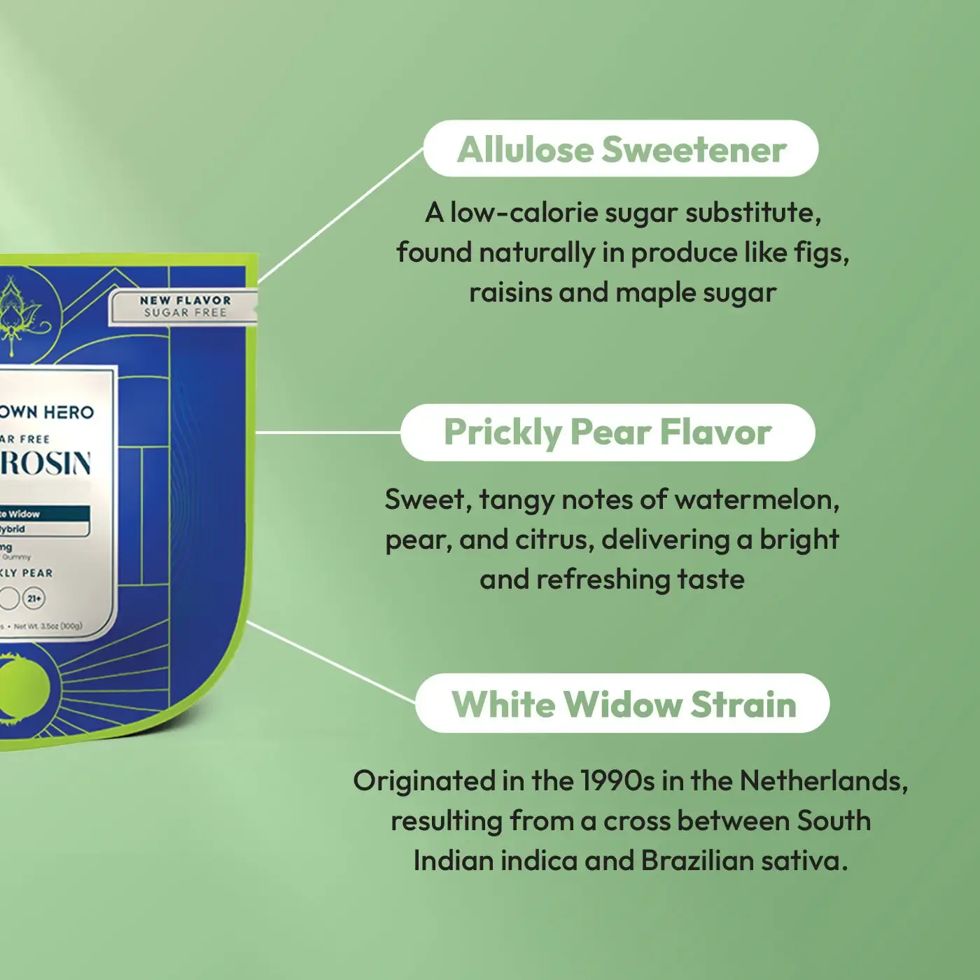 Immerse yourself in prickly pear’s mellow, tart taste with these artisan-quality, sugar-free gummies. Each piece contains 25mg Delta-9 THC, plus White Widow live rosin for a balanced hybrid experience.